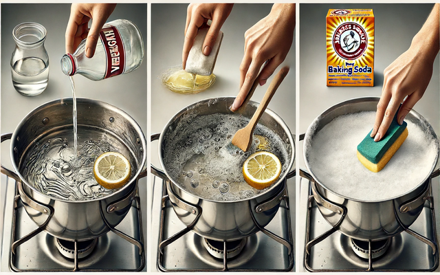 베이킹 소다를 사용해도 좋아요. 냄비에 약간의 물을 넣고 베이킹 소다를 뿌린 후 부드러운 스펀지로 문질러 닦아냅니다. 마지막으로 깨끗한 물로 헹구고 잘 건조해주세요.
