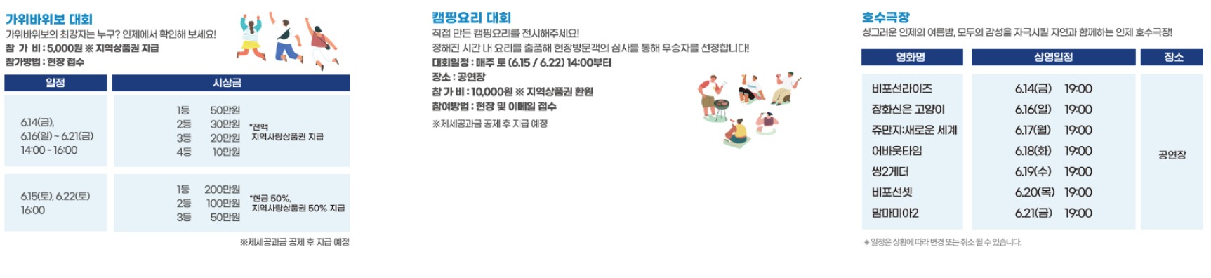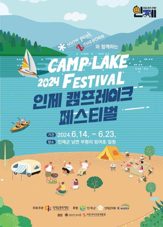 인제 캠프레이크 페스티벌은 인제 소양호 수변 감성캠핑장을 중심으로 열리는 대규모 축제입니다. 자연과 함께하는 감성 캠핑, 신나는 수상레저, 다채로운 공연과 체험 프로그램들이 여러분을 기다리고 있는데요. 몸도 마음도 힐링할 수 있는 이 축제는 온 가족이 함께 즐길 수 있는 최고의 여름 이벤트랍니다.