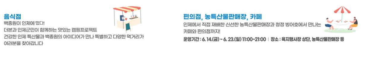 인제만의 캠핑 먹거리 장터: 인제의 특별한 먹거리를 맛볼 수 있는 장터도 열려요. 캠핑 분위기와 잘 어울리는 다양한 음식들이 준비되어 있으니 꼭 맛보세요.