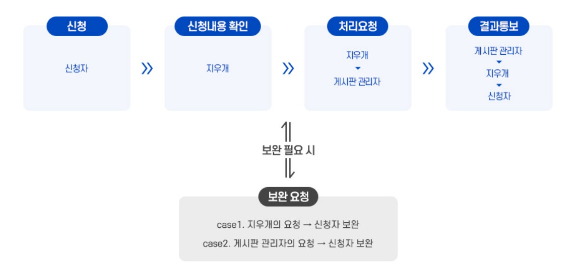이 과정에서 지우개(잊힐 권리) 서비스 담당자와 게시판 관리자는 지우개(잊힐 권리) 서비스를 신청한 사람(신청자)에게 입증자료를 보완해 달라고 요청할 수 있어요. 처리가 완료되면 결과를 알려드려요.