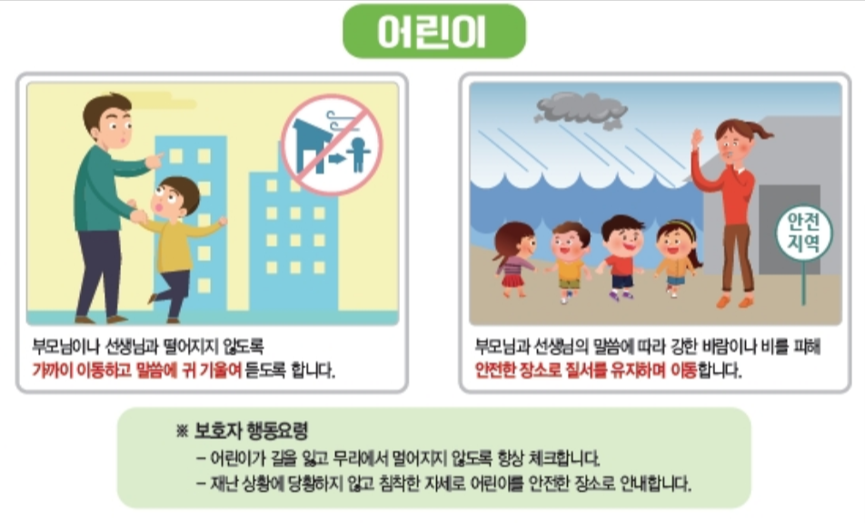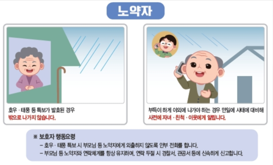 어르신, 어린이, 장애인 등 주변의 대피 약자의 안부를 수시로 확인하고, 비상 시 대피 방법을 미리 전달해 주세요. 이들이 안전하게 대피할 수 있도록 돕는 것이 우리의 책임이랍니다.