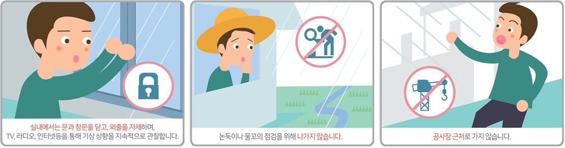 건물의 출입문과 창문은 닫아서 파손되지 않도록 하고, 창문이나 유리문에서 되도록 떨어져 있어야 해요. 강풍으로 인한 피해를 입지 않도록 가급적 욕실과 같이 창문이 없는 방이나 집안의 제일 안쪽으로 이동하는 것이 좋습니다. 가스 누출로 2차 피해가 발생할 수 있으므로 사전에 차단하고, 감전 위험이 있는 집 안팎의 전기 시설은 만지지 않도록 해야 해요. 물에 젖은 손으로 전기 시설을 만지면 안 된다는 것, 꼭 기억해 주세요! 정전이 발생한 경우 양초를 사용하지 말고 손전등이나 휴대폰 등을 사용하세요. 건물 안에 물이 조금이라도 차오를 경우 즉시 높은 곳 혹은 주변 대피 장소로 이동해야 합니다.
